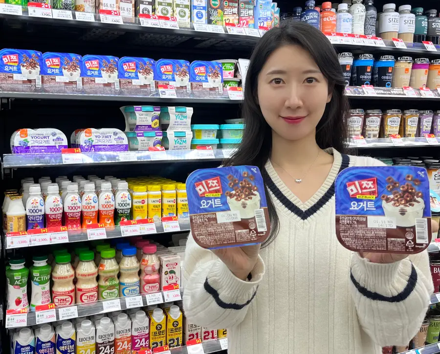 이번 신제품은 용기를 두 칸으로 나눠 한쪽에는 부드러운 플레인 요거트를, 다른 한쪽에는 바삭한 미쯔블랙 토핑을 담았다. 반으로 접히는 플립(flip)형 용기를 적용해 소비자가 취향에 따라 쉽게 섞어 먹을 수 있도록 했다.