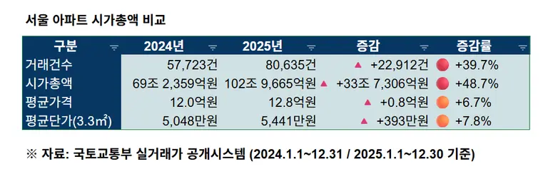 신한 프리미어 패스파인더 양지영 전문위원은 국토교통부 실거래가 공개시스템을 분석한 결과, 2025년 1월 1일부터 12월 30일까지 서울 아파트 실거래 시가총액은 102조 9665억원으로 집계됐다고 30일 밝혔다. 이는 지난해 같은 기간(69조 2359억원) 대비 48.7%(33조 7306억원) 증가한 수치다.