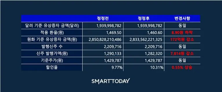 그런데 환율이 변하면서 실제발행금액에 변동이 생겼다. 주금납입일인 2025년 12월 26일 기준 최초고시 매매기준율은 1460.60원로 나타났다. 이에 따라 실제발행금액은 2조8335억원이 되었고, 1주 신주 발행가액은 128만2319원으로 바뀌었다. 할인율은 10%를 초과한 10.31%로 나타났다.
