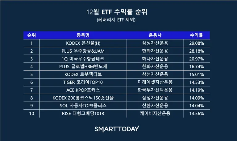|스마트투데이=이태윤 기자| 12월 국내 ETF 시장에서 우주항공 및 도심항공교통(UAM) 테마가 수익률 상위권을 장악하며 뚜렷한 강세를 보였다. 한달간 전체 수익률 1위는 은(Silver) 선물 상품이 차지했으나, 우주항공 관련 상품들이 20% 넘는 수익률로 2, 3위를 나란히 기록했다.