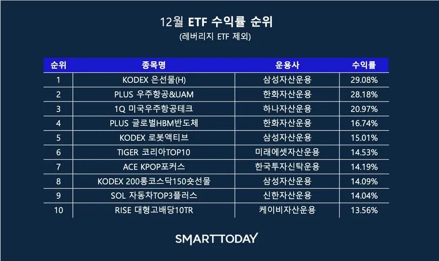 전체 수익률 1위는 삼성자산운용의 KODEX 은선물(H)이 차지했다. 해당 상품은 12월 한 달 동안 29.08% 급등했다. 미래 기술 테마인 반도체와 로봇 섹터도 견조한 흐름을 이어갔다. 한화자산운용의 PLUS 글로벌HBM반도체가 16.74%의 수익률로 4위에 올랐고, 삼성자산운용의 KODEX 로봇액티브가 15.01% 상승해 5위를 기록했다. 우주항공 테마와 더불어 기술주 중심의 상품들이 상위 5위권을 차지했다.