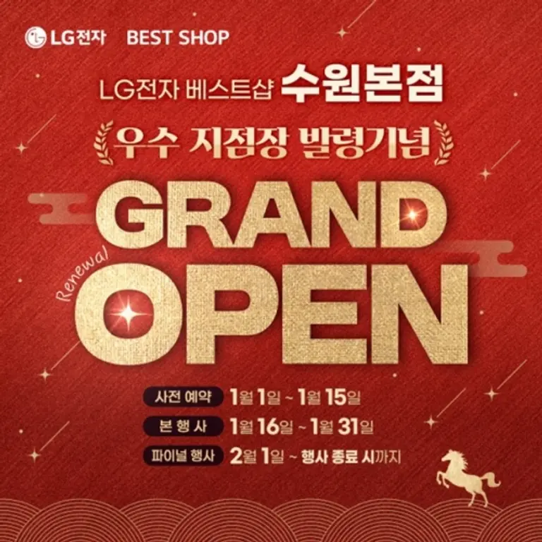 프리미엄 가전매장 LG전자 베스트샵 수원본점은 우수 지점장 발령 및 새단장을 기념해 '리뉴얼 그랜드 오픈' 가전 세일 행사를 실시한다고 5일 밝혔다.