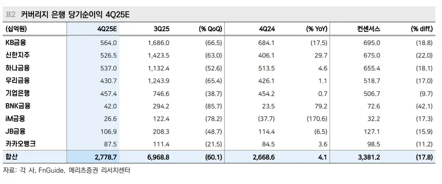 메리츠증권은 9일 자사가 분석하는 전통은행들의 작년 4분기 합산 지배주주 순이익을 직전 분기 대비 60.1% 감소, 전년 동기 대비 4.1% 늘어난 2조7800억원으로 추정했다. 컨센서스를 18% 하회할 것으로 봤다.
