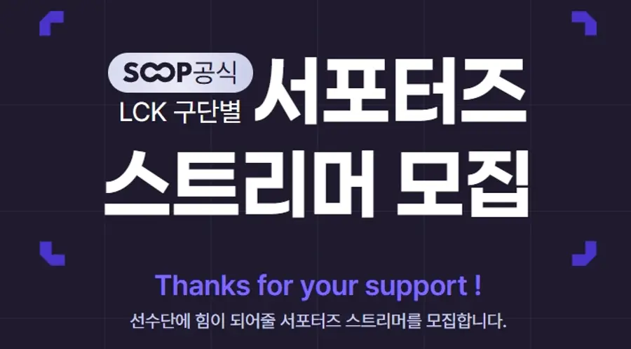 SOOP은 9일부터 2월 1일까지 SOOP 공식 LCK 구단별 서포터즈 스트리머 모집을 진행한다고 밝혔다.
