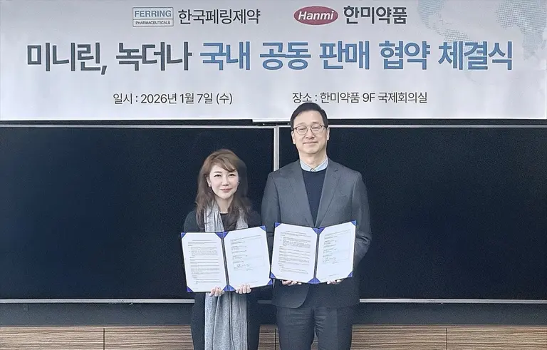 한국페링제약(대표 김민정)은 한미약품(대표 박재현)과 야간뇨ᆞ야뇨증 치료제 ‘미니린정(성분명: 데스모프레신아세트산염, 이하 미니린)’ 및 야간뇨 치료제 ‘녹더나설하정(성분명: 데스모프레신아세트산염, 이하 녹더나)’에 대한 공동판매 계약을 체결했다고 12일 밝혔다.