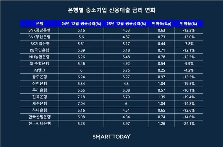반면 타 은행들은 공격적으로 금리를 낮췄다. 전북은행은 같은 기간 7.18%에서 5.79%로 1.39%p 인하하며 가장 큰 낙폭을 보였고, 한국씨티은행도 1.26%p(5.23%→3.97%)를 낮췄다.