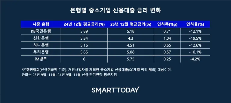 또 2024년 12월 공시 금리와 비교했을 때 iM뱅크의 인하폭은 미미했다. iM뱅크의 중소기업 신용대출 금리는 2024년 12월 6.00%에서 2025년 12월 5.75%로 0.25%p 하락하는 데 그쳤다. 이는 국내 15개 은행 중 가장 낮은 인하 폭이다.