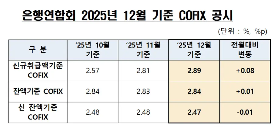 15일 은행연합회에 따르면 2025년 12월 기준 코픽스(신규취급액 기준) 2.89%로 전월대비 0.08%포인트 상승했다.