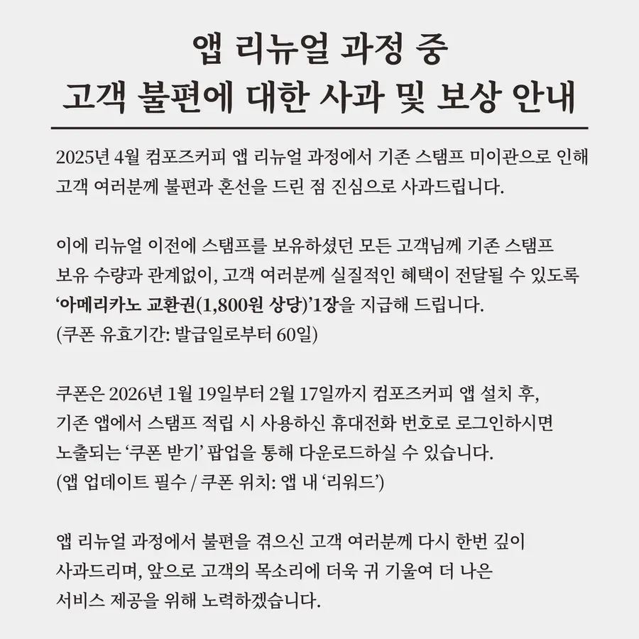 이에 컴포즈커피는 앱 리뉴얼 이전 스탬프를 보유했던 모든 고객을 대상으로, 기존 스탬프 보유 수량과 관계없이 ‘아메리카노 교환권(1800원 상당)’ 1장을 지급하기로 결정했다. 컴포즈커피는 고객에게 실질적인 혜택이 전달될 수 있는 보상 방안을 마련하는 과정에서 시스템 점검과 운영 검토가 필요했으며, 그로 인해 보상 안내까지 다소 시간이 소요된 점에 대해서도 유감의 뜻을 전했다.