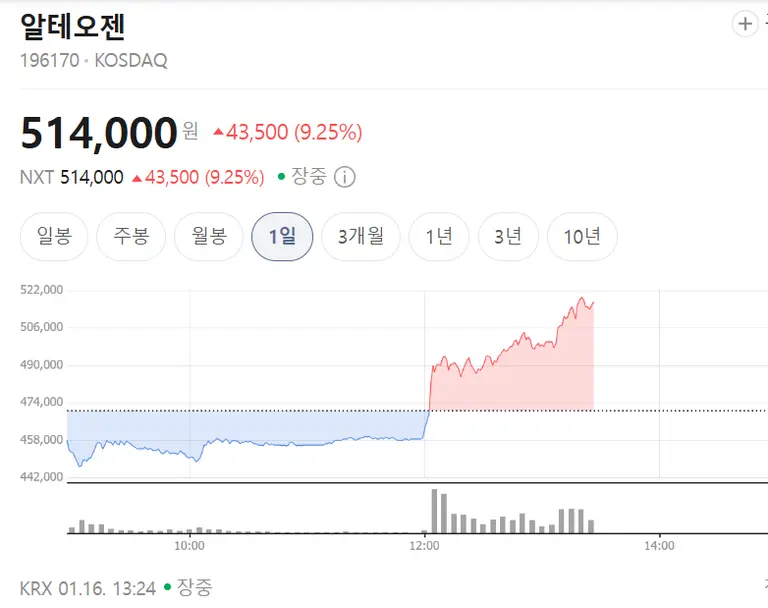16일 오후 1시14분 현재 알테오젠은 전 거래일보다 9.46% 상승한 51만5000원에 거래되고 있다. 이날 오전 한 때 4% 넘게 급락했다가 대반전이 일어나는 중이다.