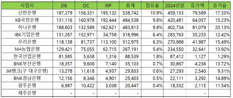 업권별 경쟁 구도 역시 치열하다. 은행권에서는 신한은행 약진이 두드러졌다. 신한은행은 시중은행 중 가장 높은 적립금을 기록해 1위 사업자인 삼성생명을 맹추격하고 있다. 퇴직연금 실물이전 제도 도입 등 시장 변화에 발맞춰 연금 관리 전용 플랫폼을 고도화하고 고객 편의성을 대폭 강화한 전략이 유효했다는 평가를 받는다.