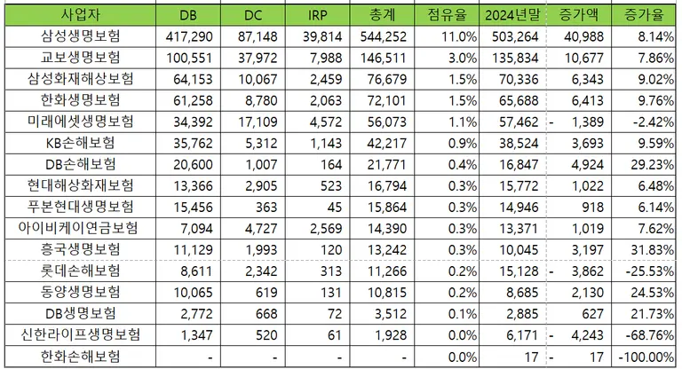 가장 괄목할 만한 성과를 낸 곳은 삼성생명이다. 삼성생명은 적립금 50조원을 넘어 시장 점유율 11%를 기록, 전체 금융기관 중 1위를 지켜냈다. 대기업 중심 확정급여형(DB) 시장에서 오랜 기간 쌓아온 탄탄한 네트워크와 운용 노하우가 이번 성장 핵심 동력이 된 것으로 알려졌다.