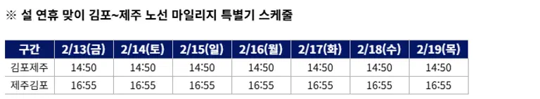 마일리지 특별기는 연휴가 시작되는 다음달 13일부터 7일간 매일 2편씩 총 14편 운영한다. 김포~제주 노선 특정 시간대에 마일리지로 우선 발권이 가능하도록 마련됐다.