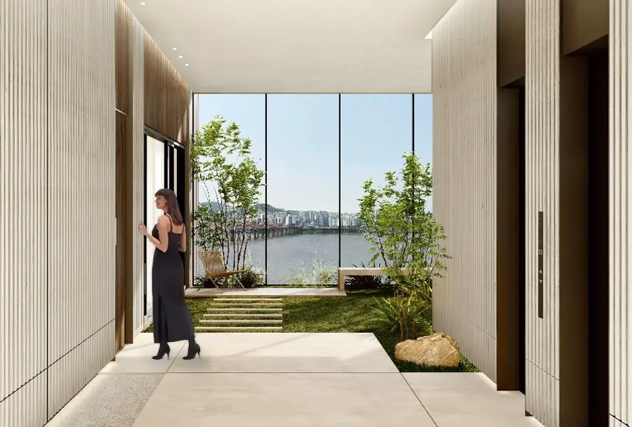 엘리베이터 홀에 들어서며 마주하는 공간을 ‘내 집 앞마당’처럼 느낄 수 있다. 초고층·고밀 주거에서 필연적으로 형성되는 코어부(엘리베이터 홀) 주변에 세대 전용 공간을 배치하고, 여기에 조경 요소를 더한 정원 형태의 서비스 공간을 조성함으로써 세대 앞에 추가적인 완충 공간을 확보했다.