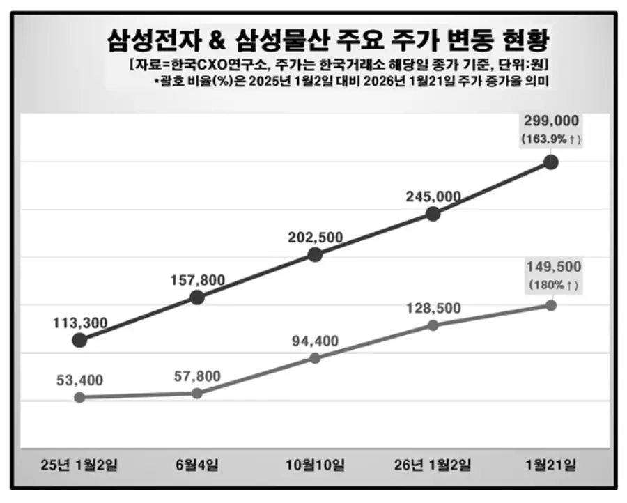 이번 기록 달성의 일등 공신은 단연 삼성전자와 삼성물산이다. 삼성전자 주가는 작년 6월 4일 5만 7800원에서 이달 21일 14만 9500원으로 158.7% 급등했다. 이에 따라 이 회장의 삼성전자 지분 가치도 14조 5634억 원으로 치솟았다. 삼성물산 역시 같은 기간 주가가 15만 7800원에서 29만 9000원으로 뛰며 지분 가치가 5조 원대에서 10조 6709억 원으로 두 배 가까이 늘었다.