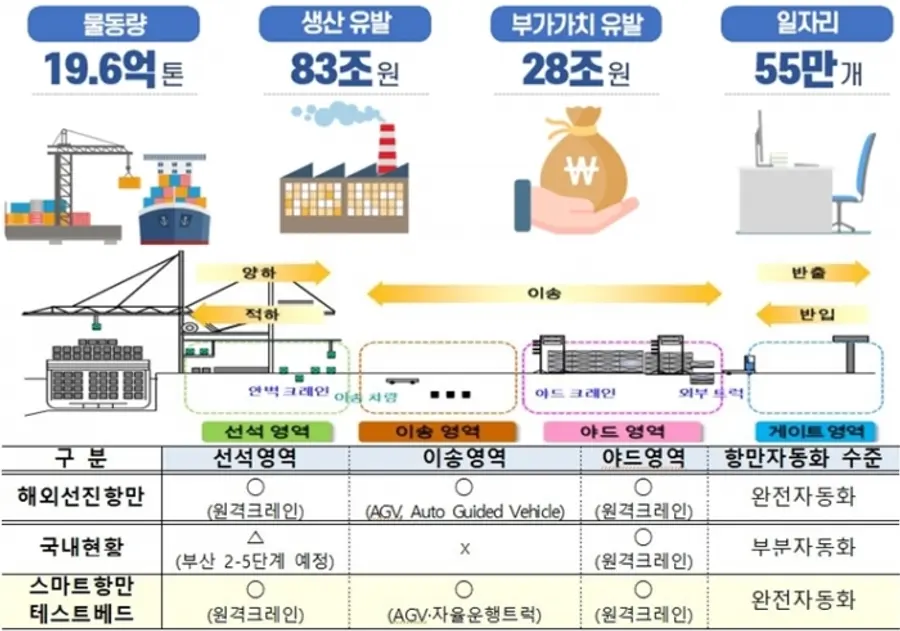 먼저 2030년까지 항만 자동화·디지털화를 본격 추진한다. 이를 위해 먼저 2026년까지 광양항에 항만자동화 테스트베드를 구축하여 국산화 기술을 개발하고 운영 경험을 쌓은 뒤 검증을 거쳐 부산항 제2신항에 2030년부터 본격적으로 한국형 스마트 항만을 운영해 나갈 계획이다.