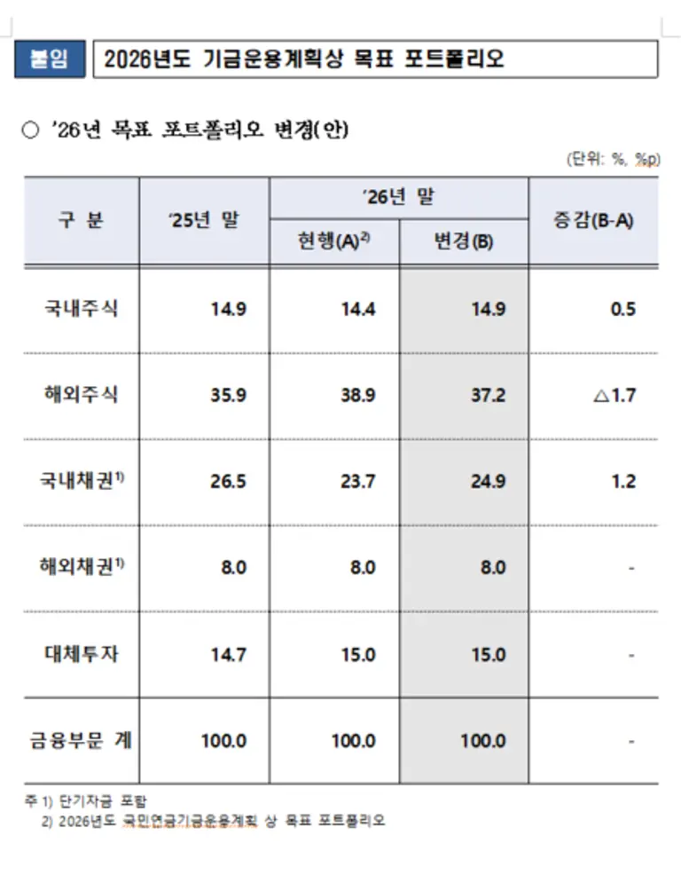 기금위는 기금규모 확대에 따른 외환조달 부담과 최근 수요 우위의 외환시장 환경 등을 고려해 2026년도 기금운용계획상 목표 포트폴리오를 변경키로 결정했다.