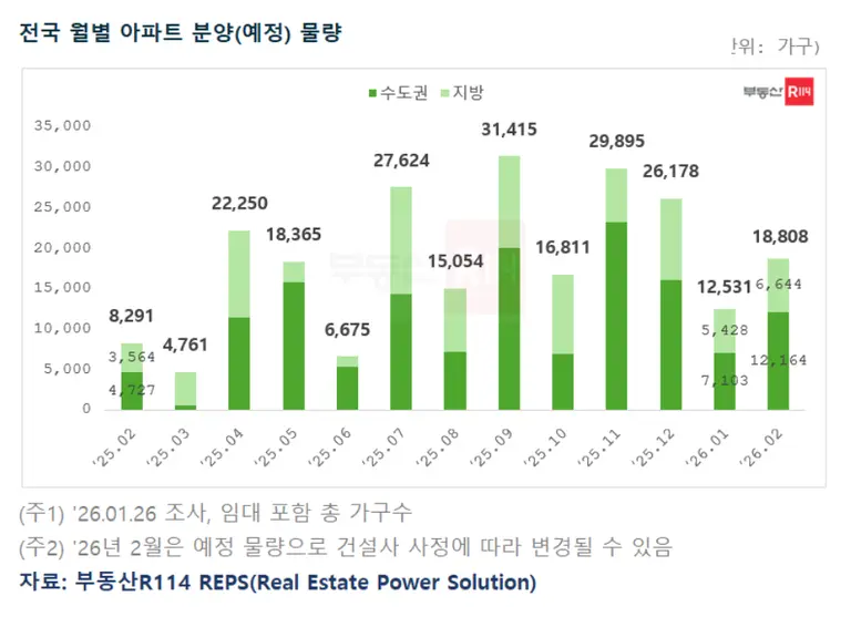 29일 부동산R114에 따르면 2월 전체 분양 물량 가운데 약 65%인 1만2164가구가 수도권에 집중됐다. 지역별로는 경기 5310가구, 서울 3439가구, 인천 3415가구 순이다. 올해 분양시장이 수도권을 중심으로 공급 확대 흐름이 이어질 것으로 보인다.