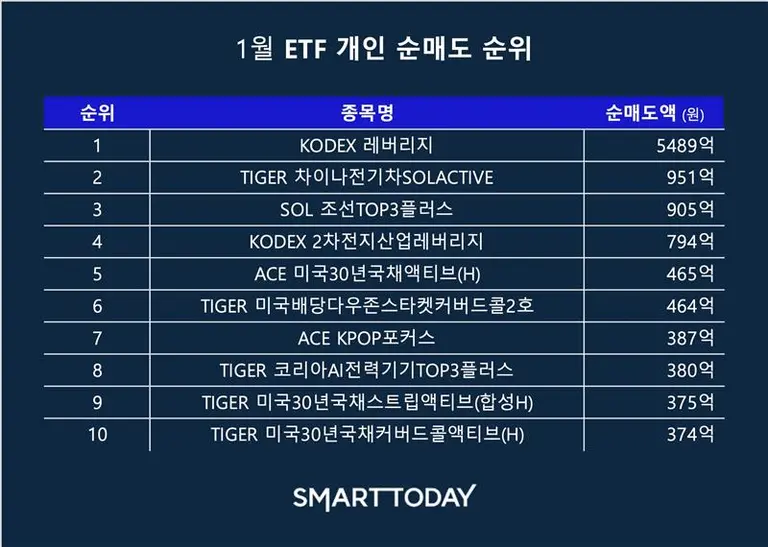 반면, 1월 개인 순매도 1위는 KODEX 레버리지였다. 5489억원을 팔아치웠다. 이는 코스피200 지수의 2배를 추종하는 상품인데, 코스닥 레버리지를 대거 매수한 것과는 정반대의 행보다. 단기간 동안 코스피가 가파르게 상승하자, 투자자들은 추가 상승에 베팅하기는 주저하는 모습이다.