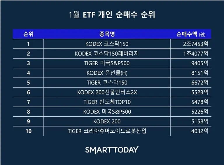 이번 1월 개인 순매수 1위는 삼성자산운용의 KODEX 코스닥150이다. 순매수액만 무려 2조7453억원에 달한다. 코스닥 시장이 저평가되었다고 판단한 투자자들이 저가 매수의 기회로 삼고 대거 진입한 것으로 풀이된다.