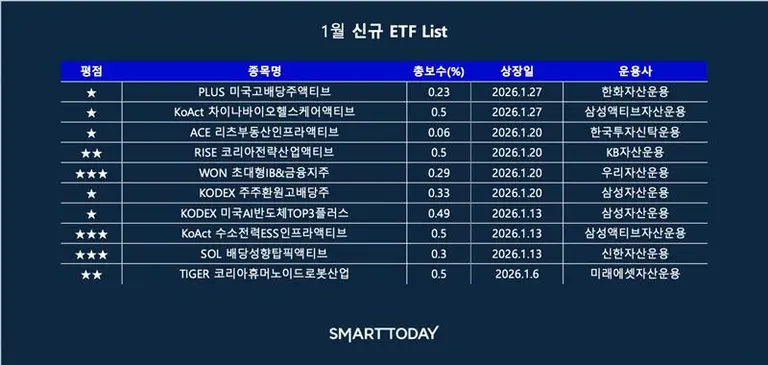 |스마트투데이=김나연, 안효건 기자| 지난 1월 새롭게 출시된 ETF는 총 10개다. 새해 첫 달 ETF 시장은 시장 초과 수익을 추구하는 액티브 전략과 매달 안정적인 현금 흐름을 제공하는 월배당 테마가 주도했다.