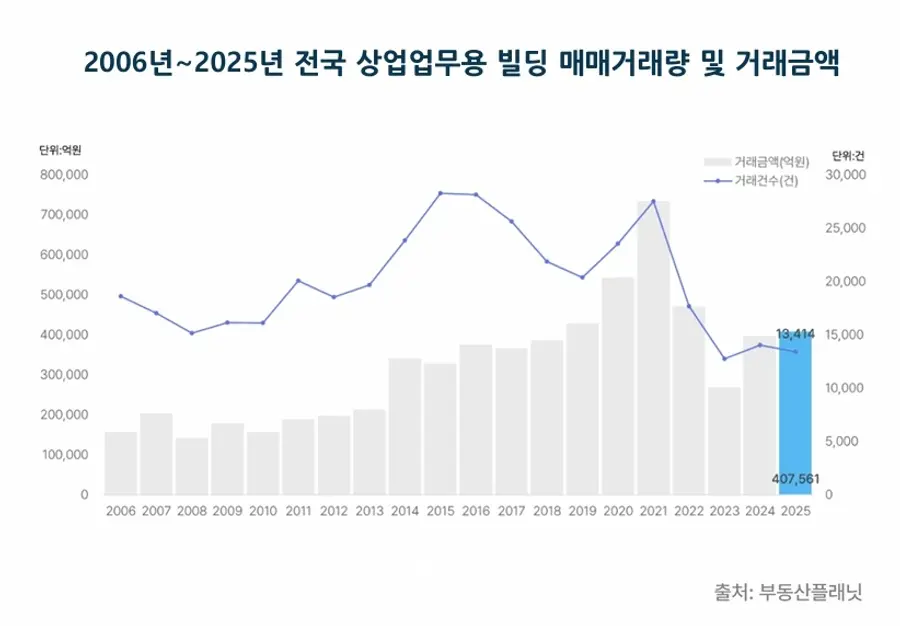 상업용 부동산 종합 서비스 기업 부동산플래닛이 3일 발표한 2025년 연간 전국 상업업무용 빌딩 거래 시장 분석 결과에 따르면 빌딩 거래량은 총 1만 3414건으로 2024년(1만4031건)과 비교해 4.4% 감소했다. 하지만 총 거래금액은 40조7561억원으로 전년도(2024년) 39조7448억원 대비 2.5% 증가한 , 2022년(47조734억원) 이후 처음으로 40조원대 규모를 기록했다.