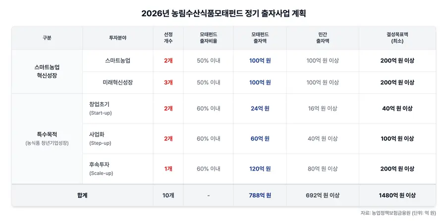 4일 농금원은 '2026년 농림수산식품모태펀드 정기 출자사업 계획'을 공고하고 GP 선정 절차에 돌입했다. 총 출자금액은 788억원이며 이를 통해 최소 1480억원 이상의 자펀드를 결성하는 것이 목표다. 농식품 모태펀드는 이번 출자를 통해 농림수산식품 경영체의 성장 단계별 지원 체계를 공고히 한다는 구상이다.