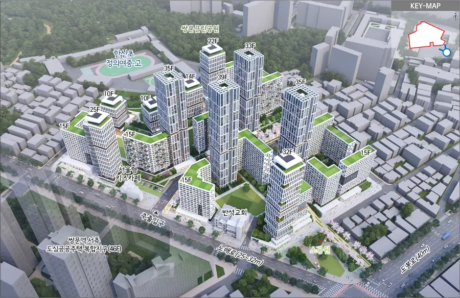 쌍문2구역은 서울시 신속통합기획 100번째 확정 구역이라는 상징성도 갖는다. 기존 가로망을 유지한 채 통경축과 공공보행통로를 조성해 인근 지역과의 생활권 단절을 최소화했고, 단지 내부 보행동선을 강화해 주변 시설 접근성도 높였다.