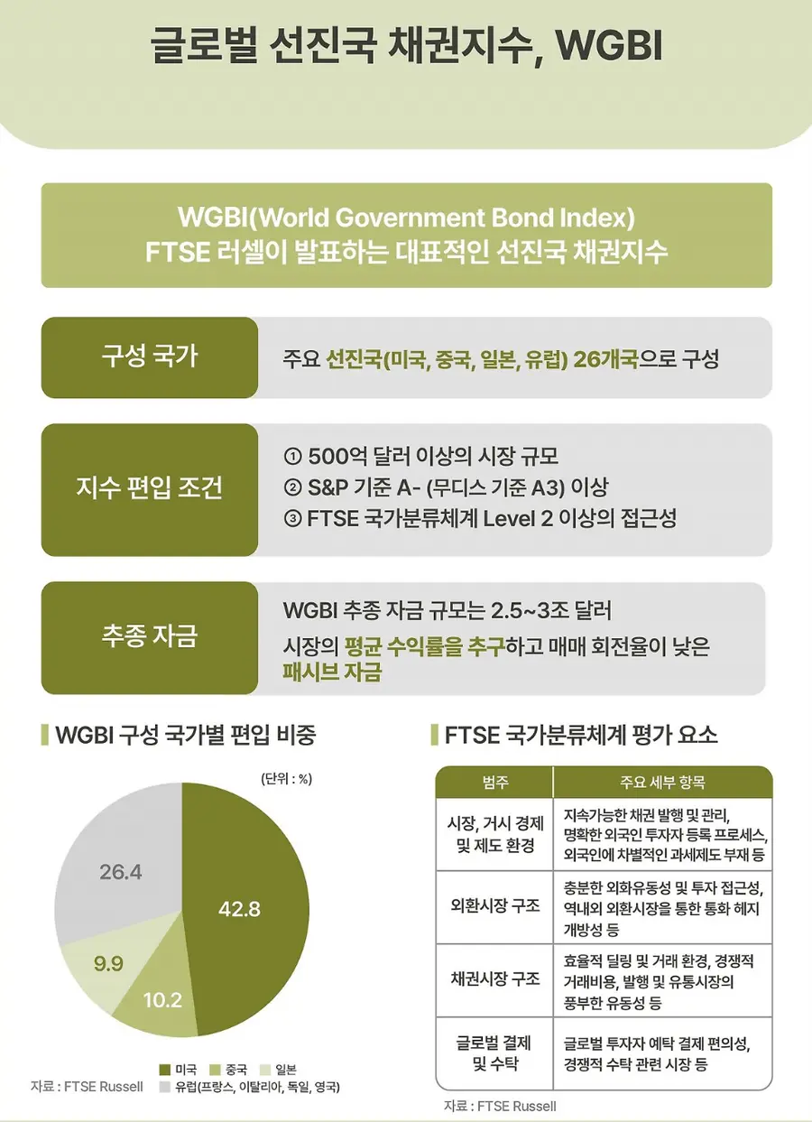 |스마트투데이=통합뉴스룸 기자| 대한민국 국채가 세계 3대 채권지수인 세계국채지수(WGBI)에 마침내 편입된다. FTSE 러셀은 우리 정부의 지속적인 제도 개선 노력을 높이 평가하여, 오는 4월부터 한국 국채를 WGBI에 정식 편입한다고 발표했다. 이는 한국 금융시장의 신뢰도가 선진국 수준으로 도약했음을 의미하며, 대규모 외국인 자금 유입에 따른 시장 안정화 효과가 기대된다.