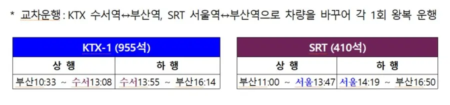 |스마트투데이=나기천 기자| 국토교통부와 한국철도공사(코레일)·에스알은 25일 고속열차 교차운행 시범사업을 앞두고 11일부터 승차권 예매를 개시한다고 10일 밝혔다.
