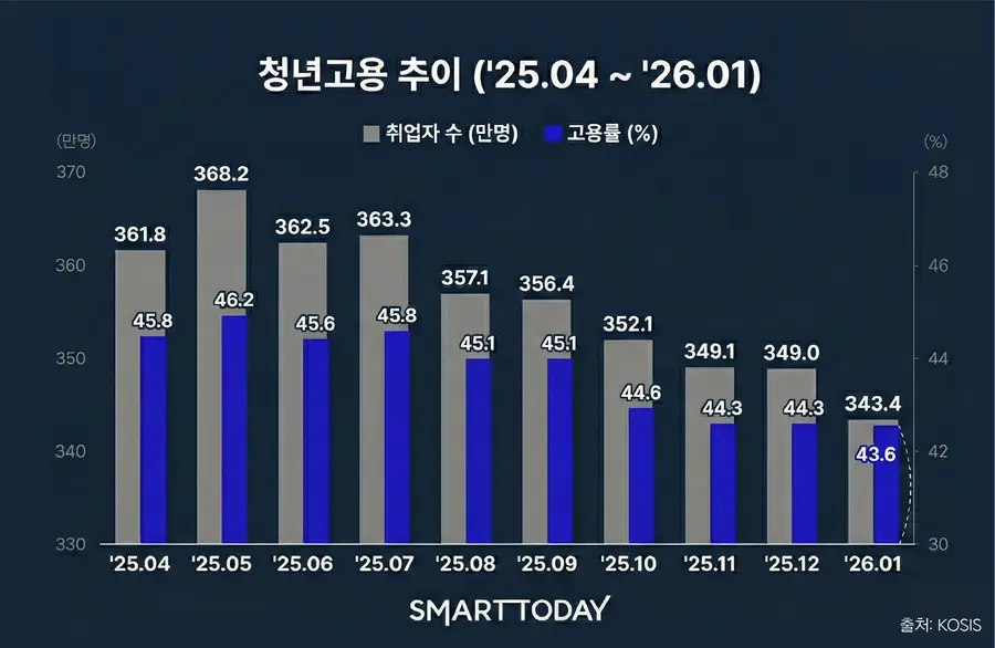 13일 최근 국가데이터처가 발표한 ‘1월 고용동향’에 따르면, 청년층 고용률은 43.6%로 전년 대비 1.2% 포인트 하락했다.