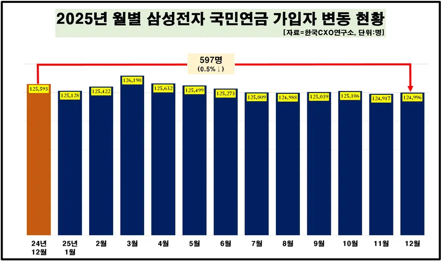 20일 기업분석전문 한국CXO연구소가 내놓은 ‘2025년 삼성전자 직원 평균 보수 분석 및 인건비 변동, 월별 국민연금 가입자 현황’ 결과에 따르면 지난해 12월 기준 국민연금 가입자 기준 직원수는 12만4996명으로 1년 전 12만5593명보다 0.5%. 597명 줄었다.