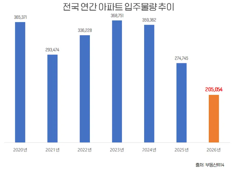 부동산R114 자료에 따르면 올해 전국 신축 아파트 입주 물량은 20만 5054가구로 집계됐다. 2023년 35만 9362가구와 비교하면 약 15만4000가구(43%) 줄어든 규모다. 2021년 부터 2024년까지 매년 30만가구 안팎을 유지하던 입주 물량은 2025년 27만4745가구로 감소세로 돌아섰고, 올해는 20만가구 선마저 위협받고 있다. 이는 2010년대 중반 이후 최저 수준이다.