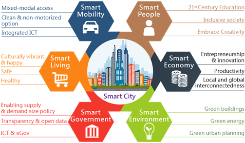“스마트시티는 스마트 에너지, 스마트 빌딩, 스마트 모빌리티, 스마트 헬스케어, 스마트 인프라, 스마트 기술, 스마트 거버넌스, 스마트 교육, 스마트 시민 등 8가지 스마트 매개 변수 중 최소 5가지 이상을 채택할 수 있는 '스마트' 및 '지능형' 솔루션과 기술을 기반으로 구축된 도시다.”