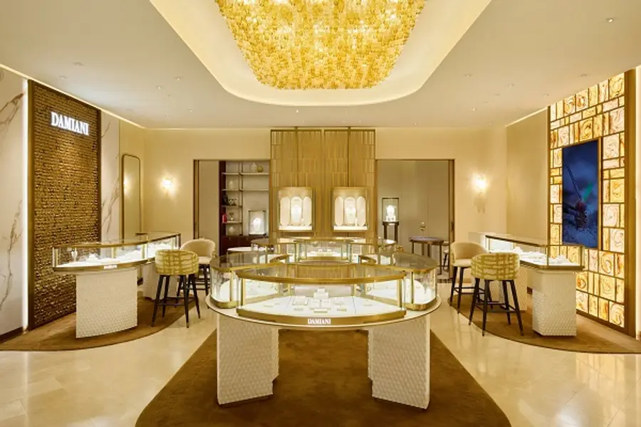 특히 메종의 아이코닉 컬렉션인 벨 에포크(Belle Époque)에서 착안한 원과 직사각형의 기하학적 모티프는 카페트와 벽면 디자인에 반영되어, 공간 전반에 브랜드의 정체성을 더욱 선명하게 드러낸다. 여기에 다미아니 그룹 산하의 무라노 유리 공예 브랜드 베니니(Venini)의 아티스틱 오브제와 샹들리에가 더해져 공간의 예술적 깊이를 더한다.