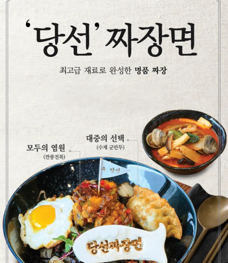 이번에 출시된 ‘당선 짜장면’은 3만 원이라는 고가에도 불구하고 확실한 상징성을 내세웠다. 승리를 상징하는 전복 깐풍 요리와 ‘한 표의 진심’을 담은 수제 군만두를 곁들여 메뉴의 격을 높였다. 여기에 계란후라이와 짬뽕 국물을 더해 구성의 풍성함을 갖췄다.