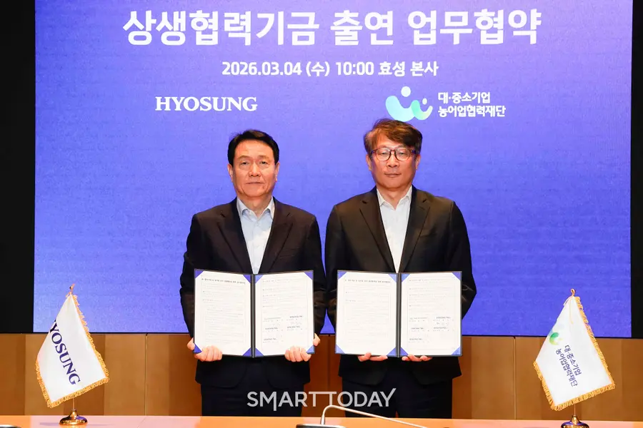 |스마트투데이=이재수 기자| 효성은 4일 서울 마포 본사에서 대·중소기업·농어업협력재단과 ‘대·중소기업 및 농어업 분야 상생협력을 위한 업무협약’을 체결했다고 5일 밝혔다. 이번에 출현한 상생협력기금은 160억원으로 역대 최대 규모다.