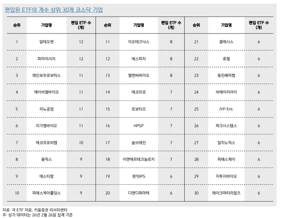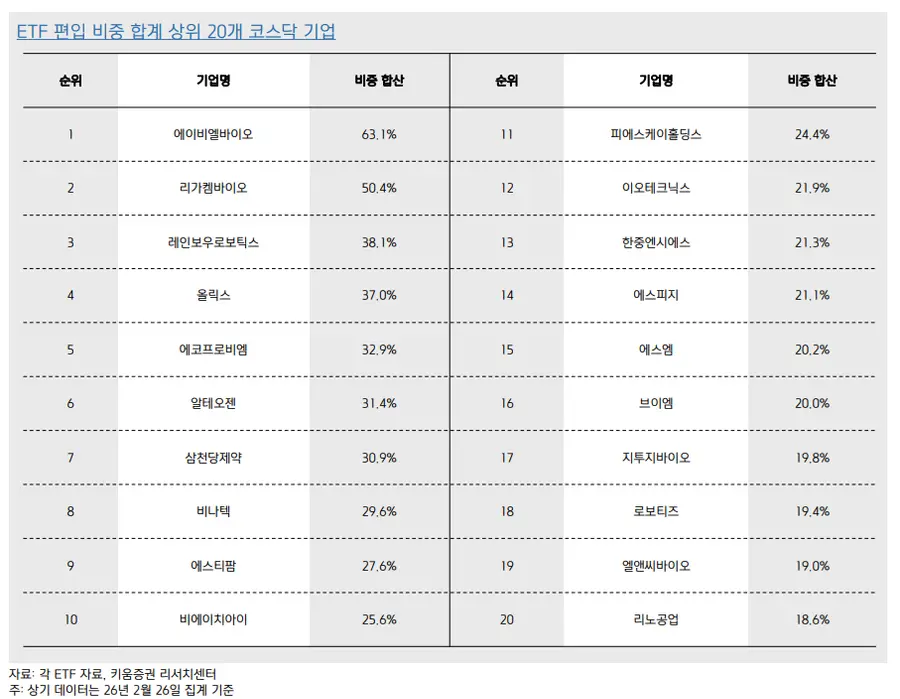 한편으로 전체 ETF 내 편입 비중 합계 상위순으로는 에이비엘바이오, 리가켐바이오, 레인보우로보틱스, 올릭스, 에코프로비엠, 알테오젠, 삼천당제약, 비나텍, 에스티팜, 비에이치아이, 피에스케이홀딩스, 이오테크닉스, 한중엔시에스, 에스피지, 에스엠, 브이엠, 지투지바이오, 로보티즈, 엘앤씨바이오, 리노공업 등 20개로 조사됐다.