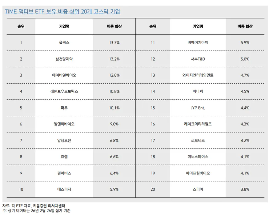 타임폴리오자산운용 액티브ETF 내 보유 비중이 높은 20개 종목은 올릭스, 삼천당제약, 에이비엘바이오, 레인보우로보틱스, 파두, 엘앤씨바이오, 알테오젠, 휴젤, 펄어비스, 에스피지, 비에이치아이, 서부T&D, 와이지엔터테인먼트, 비나텍, 제이와이피엔터테인먼트, 레이크머티리얼즈, 로보티즈, 이노스페이스, 에이프릴바이오, 스피어로 나타났다.