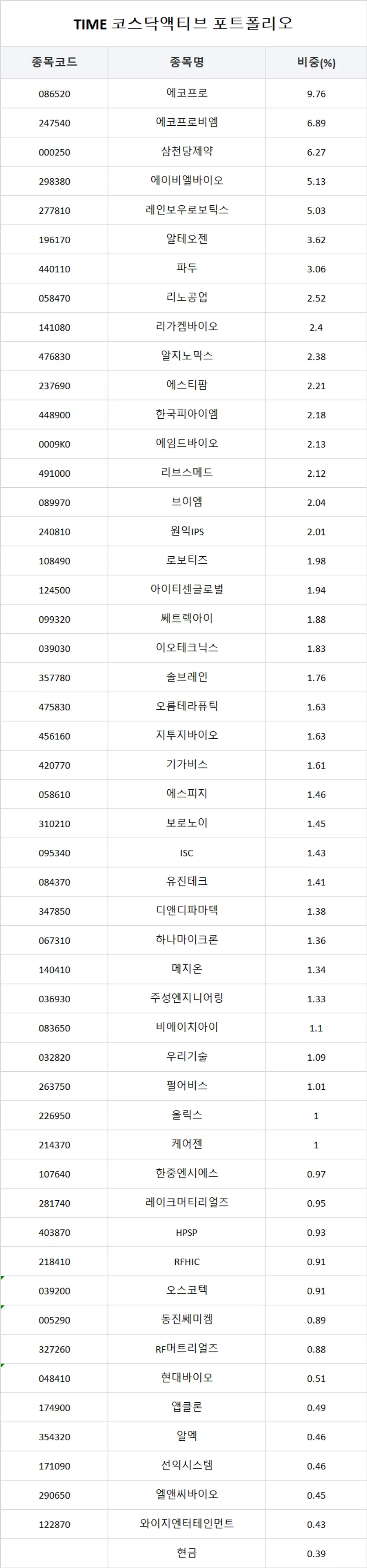 타임폴리오 코스닥액티브ETF 포트폴리오 내역은 다음과 같다.