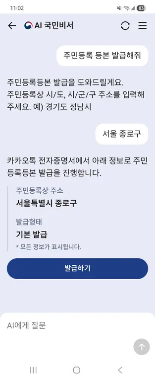 예를 들어, 대화창에 “주민등록등본을 발급해줘”라고 입력하면, AI 국민비서가 발급 가능 여부를 안내하고 인증 절차를 거쳐 전자증명서 발급까지 자연스럽게 이어준다.