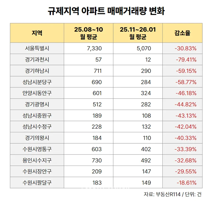 11일 부동산R114에 따르면 서울 아파트 매매거래량은 대책 전 3개월(2025년 8월~10월) 월 평균 7330건에서 주택시장 안정화 대책 이후 3개월(2025년 11월~2026년 1월) 평균 5070건으로 30.83%(2,260건) 감소했다. 이미 규제가 적용됐던 강남3구(서초·강남·송파)와 성동구를 제외한 대부분 지역에서 거래량이 줄어 규제 여파가 시장 전반으로 확산되고 있는 것으로 나타났다.