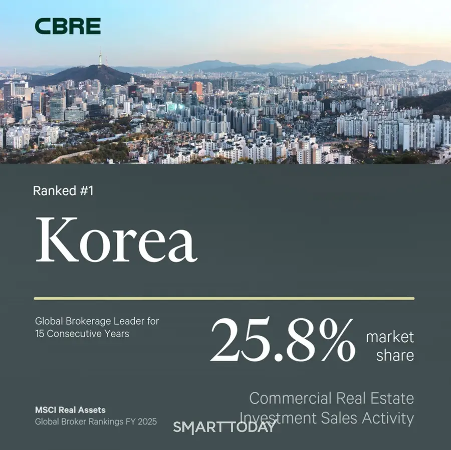|스마트투데이=이재수 기자| 글로벌 최대 종합 부동산 서비스 기업 CBRE 코리아는 MSCI Real Assets 선정 '2025년 글로벌 상업용 부동산 투자 자문 순위'에서 한국 상업용 부동산 투자 자문 부문 1위에 올랐다고 17일 밝혔다. MSCI Real Assets는 글로벌 투자지수 및 리서치 기관인 MSCI Inc.가 제공하는 부동산·인프라 등 실물자산(Real Assets) 관련 데이터, 지수, 분석 서비스다.