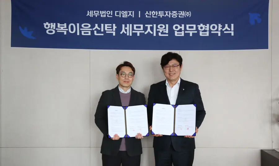 |스마트투데이=김세형 기자| 신한투자증권은 상속∙증여 특화 신탁 서비스인 ‘신한 프리미어 행복이음신탁’ 서비스 강화를 위해 세무법인 디엘지와 전략적 업무협약(MOU)을 체결했다고 25일 밝혔다.