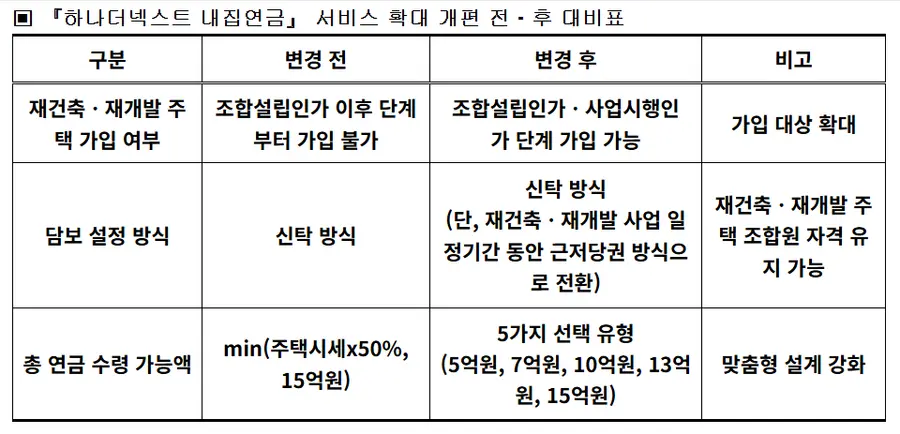 하나금융그룹 관계자는 “재건축ㆍ재개발 주택 보유자 등 더욱 많은 시니어 손님들의 안정적인 거주를 보장하고, 든든한 현금흐름으로 미래를 준비하실 수 있도록 ‘내집연금’ 서비스를 확대 개편했다”며, “앞으로도 시니어 세대의 성공적인 노후 해결책을 위한 포용적 시니어금융 모델을 지속적으로 확장해 나가겠다”고 밝혔다.