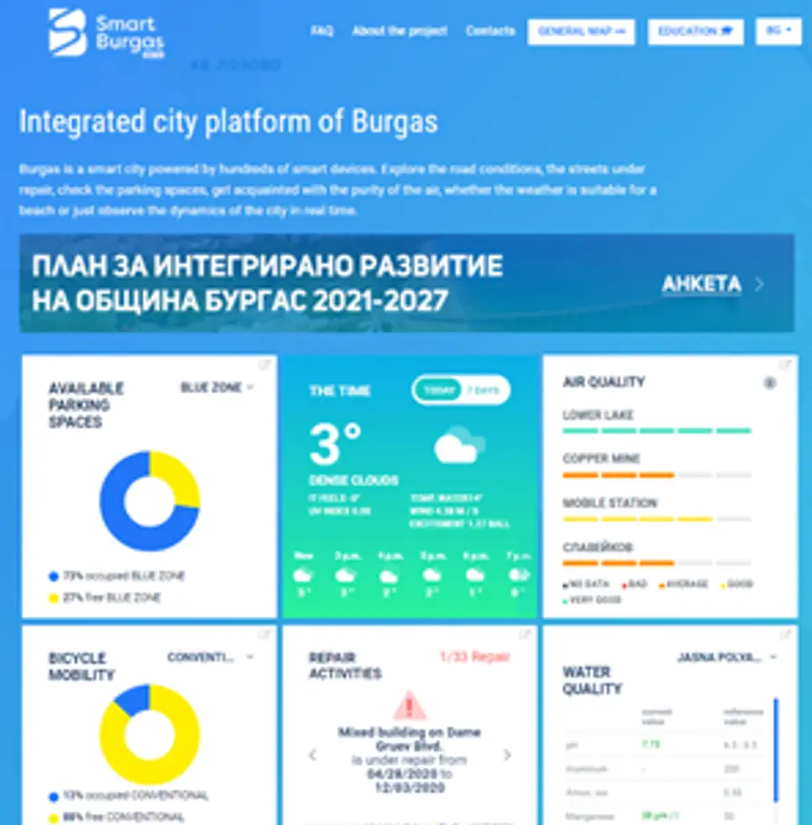 대표적인 사례가 '스마트 부르가스(Smart Burgas)’이다. 부르가스시는 날씨, 교통, 대기오염 상황 등 일상 생활에 유용한 정보를 실시간으로 모니터링하여 스마트 부르가스를 통해 시민들에게 제공하고 있다. 또한, 버스 등 대중교통 스케쥴을 실시간으로 확인할 수 있는 스마트 교통 정보, 주변 환경에 따라 자동으로 운영을 조정하는 스마트 가로등 등도 추진 중이다.