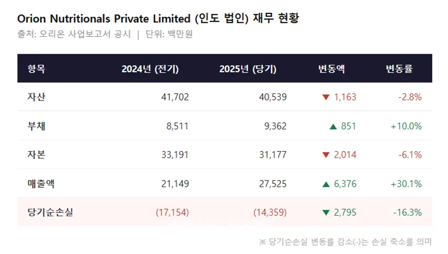 9일 오리온이 최근 공시한 사업보고서에 따르면, 인도 법인 오리온 뉴트리셔널스 프라이빗 리미티드(Orion Nutritionals Private Limited)는 2024년 171억5400만원, 2025년 143억5900만원의 순손실을 기록했다. 손실 규모는 전년 대비 약 16.3% 줄었으나, 2년 연속 적자였다.