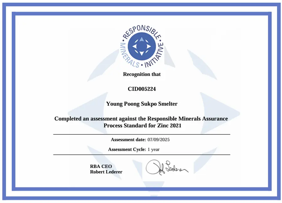 |스마트투데이=나기천 기자| 비철금속 제련기업 ㈜영풍이 석포제련소의 아연과 전기동 제련공정이 글로벌 책임광물 협의체인 RMI(책임광물 이니셔티브)의 핵심 프로그램 ‘RMAP’(책임광물 보증 프로세스) 인증을 획득해 ‘적합 제련소’로 공식 등록됐다고 13일 밝혔다.