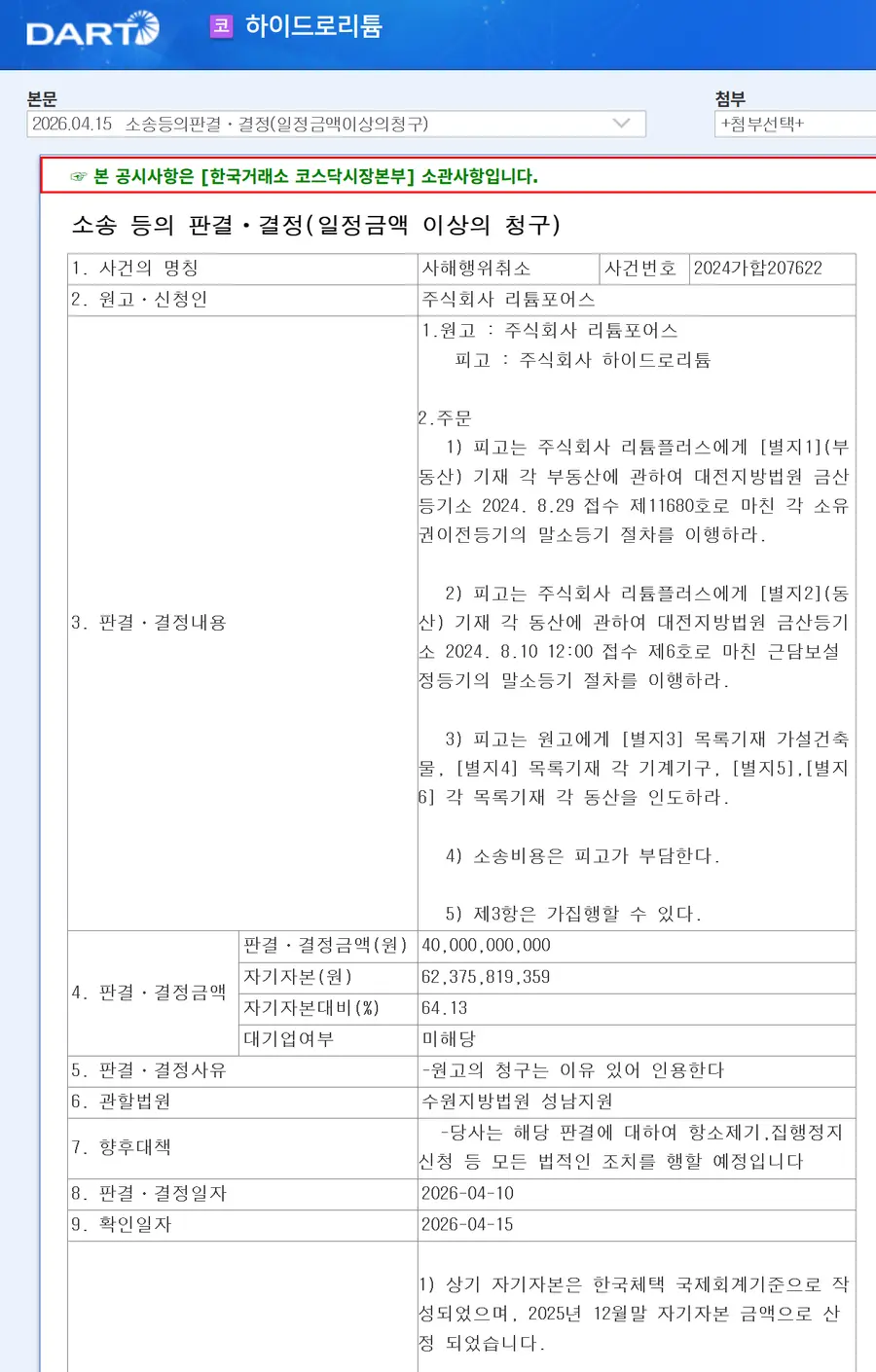 16일 금융투자(IB) 업계에 따르면 수원지방법원 성남지원 제2민사부는 최근 리튬포어스가 하이드로리튬을 상대로 제기한 사해행위취소 소송에서 원고 전부 승소 판결을 내렸다.