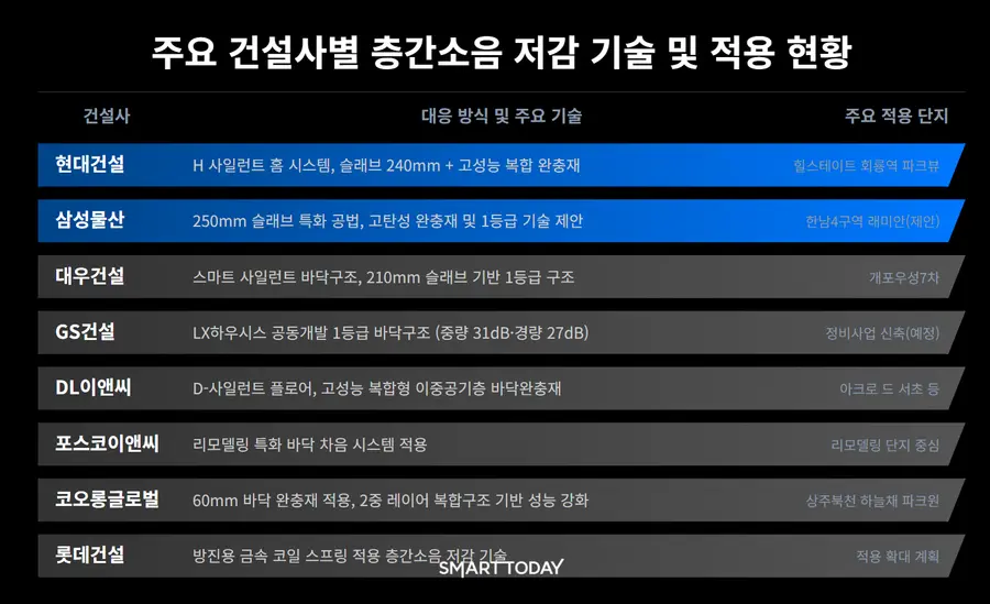 재건축 수주전에서도 경쟁은 치열하다. 대우건설은 개포우성7차에 350mm 바닥 구조를, 삼성물산은 한남4구역에 370mm 바닥 구조를 각각 제안하며 차별화에 나섰다.